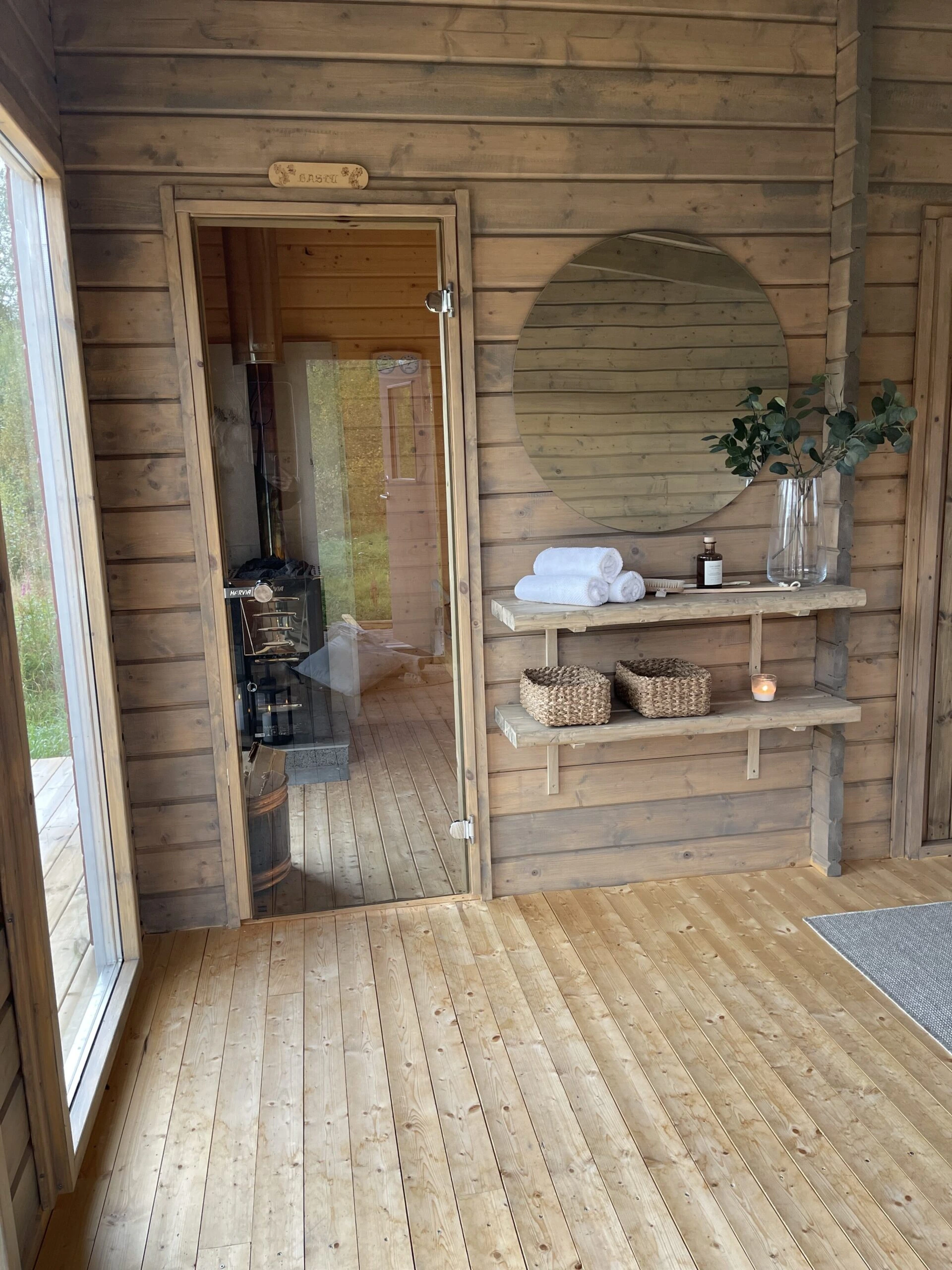 Golvet i både omklädningsrummet och bastudelen måste lackas med golvlacken för att täppa till träets porer som sedan skyddar mot vatten och smuts. Bastulavarna måste också behandlas med bastulavsoljan för att skydda mot vatten och bakterier från kropp. Rekommenderas!