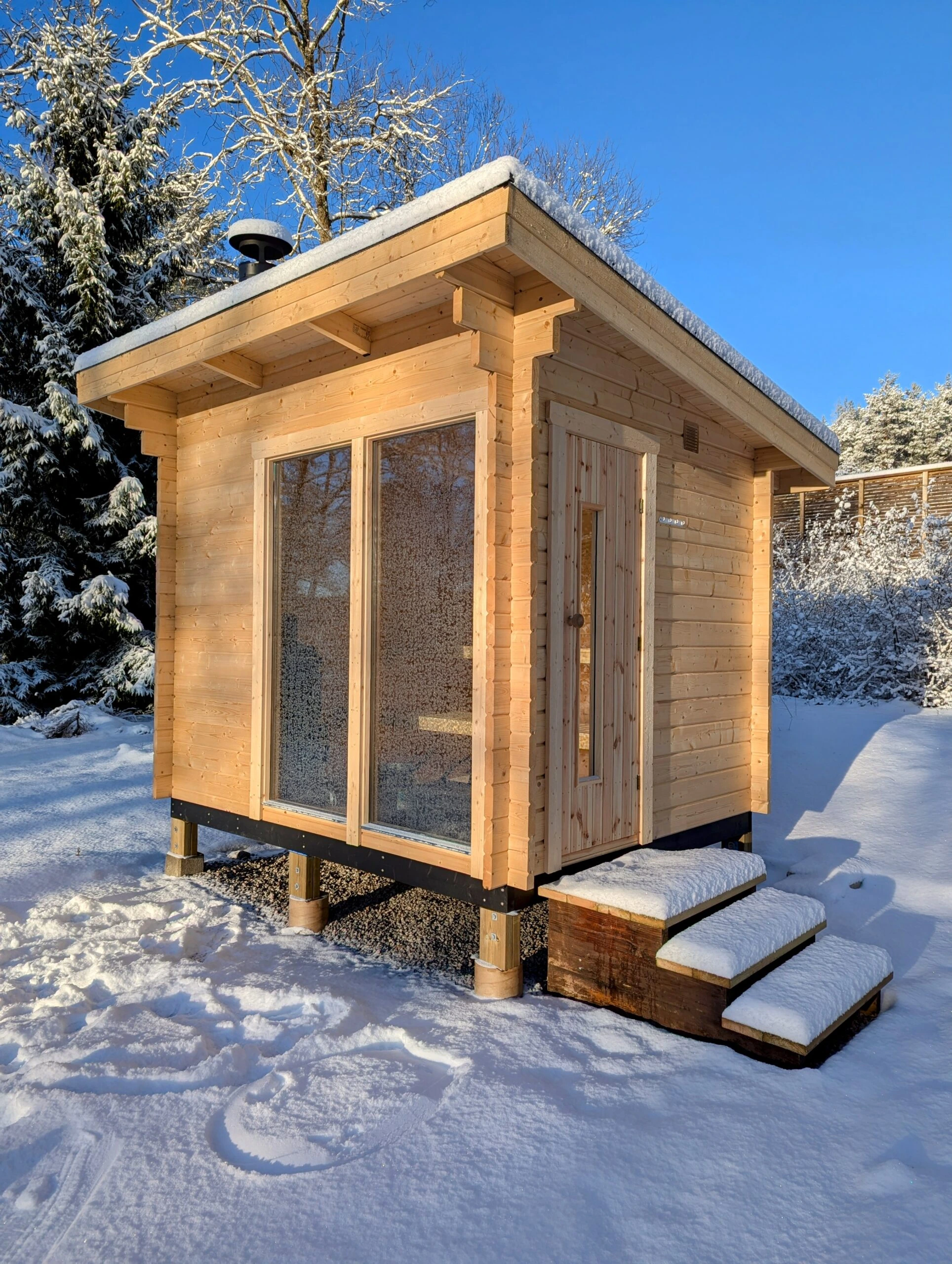 Stugan levereras som byggsats och levereras i en specialtillverkad pall som är väl emballerad så den kan stå utomhus.